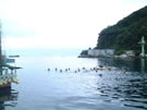 | 曇り空の中、スイム3.5Kmのスタートが切られる。自然の海をワンウェイで泳ぐトライアスロンは日本では唯一、本大会だけだ。 |