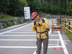 ここまでは通常の山登りでしたが、これからが本番!!みな靴を履き替え、その上から「軍足」を履き始めました。これは、川の中を歩くのに滑らないようにするためです。レースで選手がしているのをみて試してみたら、その効果に驚いて定番になったそうです。靴の上から靴下を履く??始めはなんの事やらさっぱりわかりませんでしたが、なるほど、ホントに滑らなくて荷物にもならず凄いアイデアだと思いました。