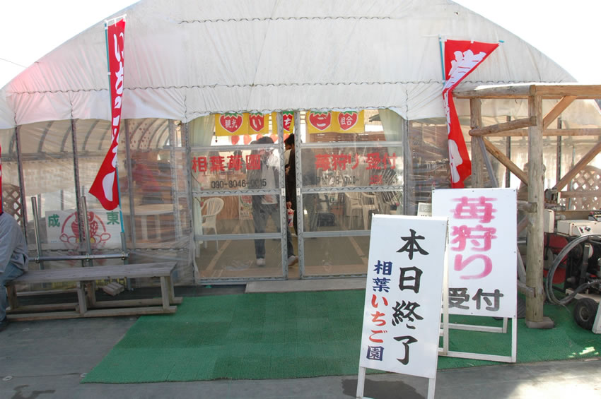 案内された苺ハウス”あきひめ””紅ほっぺ”(別のハウス)を手がイチゴ色になるくらい食べました。”あきひめ”のハウスの隅に咲いているピンク色をした花の苺は甘い林檎のようなさっぱりとした味で美味しかった。新品種かも?